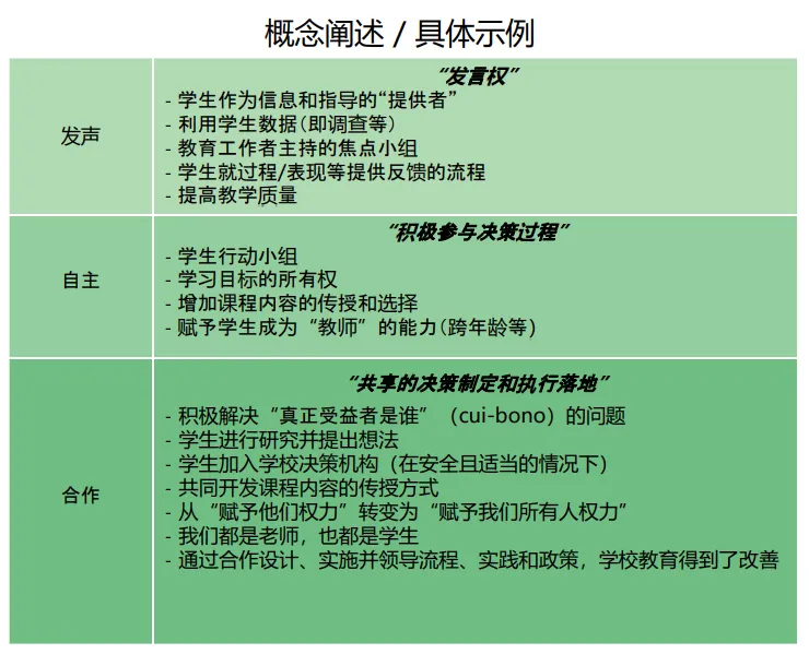 此框架将学生参与视作一个涵盖多种可能性与适宜性的连续谱系,其核心目标是鼓励学生全面、积极地参与所有教育环节中影响他们身心健康的对话交流。